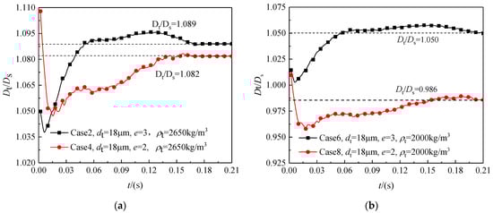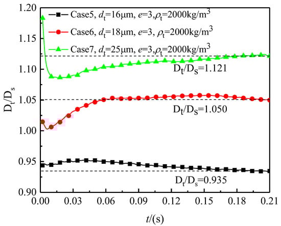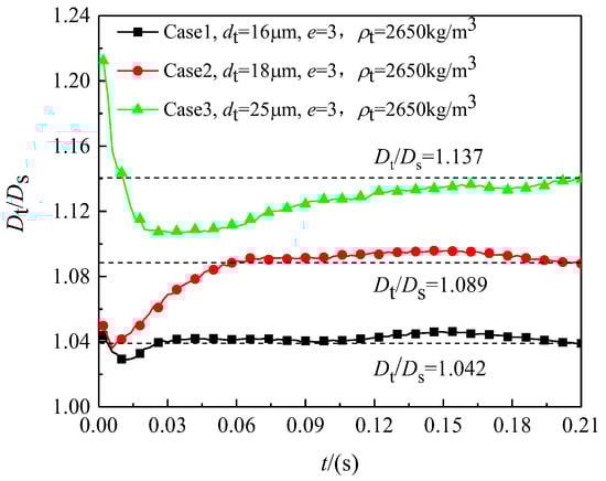 By reducing the mass density ρt of the tracer from 2650 kg/m3 to 2000 kg/m3 and keeping e0 = 3, Figure 9 compares the variation of Dt/Ds with t for the same diameter ratios dt/ds = 1.6, 1.8, and 2.5 (i.e., Cases 5~7 in Table 4). By comparing Figure 9 to Figure 8, it can be seen that the mass density of the tracer had little effect on the variation of Dt/Ds with time. However, the stable values of Dt/Ds were reduced, i.e., the reductions were about 1.4%, 3.5%, and 10%, respectively, for dt/ds = 1.6, 1.8, and 2.5.