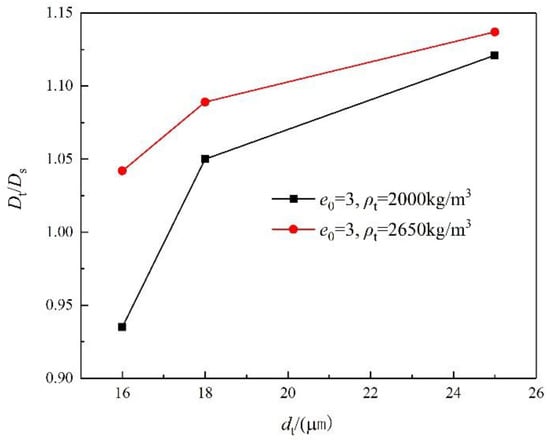 Figure 8 compares the time variation of the ratio (Dt/Ds) between the statistical displacements of the tracers Dt and the slurry particles Ds for three cases of dt/ds = 1.6, 1.8, and 2.5, i.e., Cases 1~3 in Table 4. The mass density of the tracer and the initial void ratio of the slurry were taken as ρt = 2650 kg/m3 and e0 = 3, respectively. Obviously, better representativeness of the tracer for the slurry particles can be achieved when Dt/Ds is closer to 1. It can be seen from the figure that Dt/Ds tends to be stable after the previous fluctuations. The stable values of Dt/Ds in Cases 1~3 were 1.042, 1.089, and 1.137, respectively. The observations indicate that the representativeness of the tracer decreases when the diameter ratio between the tracer and the slurry particle (dt/ds) increases.
