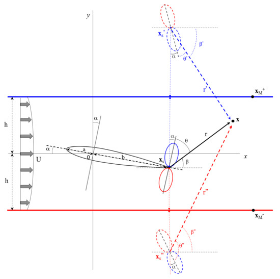 Another, simpler, option would be to keep the hard-wall wind tunnel as is, while accounting properly for its reverberation effects. This, for instance, is commonly achieved when performing noise source localization using acoustic holography techniques within reverberant environments [37,38,39]. There, specific post-processing techniques are employed, which allow de-biasing the localization results from all reverberation effects induced by the vein. In the present case, such de-biasing could be achieved a posteriori by correcting the noise measurements from all reverberation biases, or they could rather be conducted a priori by flush-mounting the microphone(s) where these biases are less. This however requires the reverberation effects to be characterized, both qualitatively and quantitatively. As was previously shown by the present author and other researchers for similar airframe noise problems, assessing the so-called acoustic installation effects incurred by facility apparatus can be achieved using numerical simulation [20,27,28]. Doing so, however, usually entails a computational complexity and/or cost which may restrict the generality of the observations made, if only because it prevents extensive parametric investigations to be performed. Therefore, one may wish to rather privilege the use of analytical means, in the fashion of what was made for exploring the aerodynamic installation effects incurred by closed-vein wind tunnels [40,41]. To the author’s knowledge, assessing analytically their acoustic counterpart has not been attempted yet. This is what is proposed in the present study, whose outcomes are both methodological (modeling aspects) and phenomenological (acoustic installation effects). More precisely, here, an analytical model is first derived, which allows predicting the wall-induced reverberation effects that an as-like airfoil TE noise source (2D harmonic dipole) shall be subjected to, when radiating within a closed-vein, hard-wall, wind tunnel. These effects are then assessed through a parametric investigation so as to characterize their impact on noise measurements that would be performed using flush-mounted microphones located on the vein’s walls.