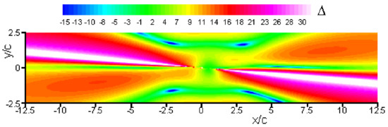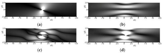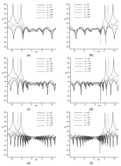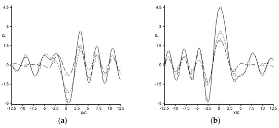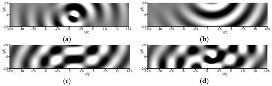 The above Equations (64)–(66) constitute the primary methodological outcome of the present study. They allow predicting in a straightforward manner what would be the resulting acoustic field to occur within and along the walls of a 2D vein, should a harmonic dipolar noise of frequency (f) be radiated from the trailing edge of an airfoil set at an incidence (α). By extension, these equations offer discriminating the field’s various components (e.g., incident, reflected), so as to isolate the installation effects incurred by the vein and, thus, to assess their impact on the noise measurements. This point is illustrated hereafter.