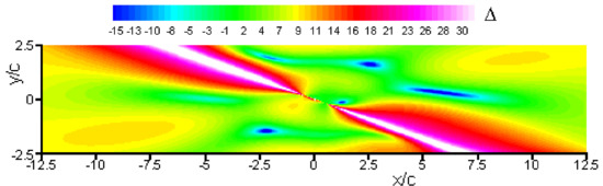 For the top (resp. bottom) wall microphones, this effect can be inferred using Equation (65) (resp. Equation (66)). In this equation, the two first terms are balanced by a third one, which involves a quantity (with and for the top and bottom walls, respectively). This quantity varies between 1 and −1, depending on the values taken by the 2π-modulo remainder of . The latter term is driven by the difference in the propagation paths between the incident and reflected waves, which ultimately translates into possible phase delays. Indeed, considering that the wave number is with λ the wavelength, one has . The phase delay and subsequent interference effect thus depends on how the difference in propagation paths scales with the wavelength. For instance, whenever the former is an exact multiple of the latter (, then , i.e., the RMS delta is minimized (given the negative sign of the cosines product, cf. Equations (65) and (66)). Oppositely, when the difference in propagation paths is an odd multiple of half the wavelength ( then , and the RMS delta is maximized (cf. Equations (65) and (66)). As an illustration, let us consider the particular (and simplest) case of M1± microphones ( when the airfoil is put at no incidence (α = 0), i.e., the source is located at , . Considering that, in the present case b = c/2 as well as c = h/2.5 (cf. Section 2.2.6), the top wall microphone M1+ is such that (cf. Equations (29), (31) and (65))