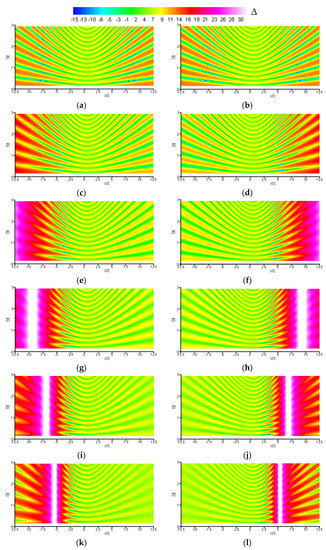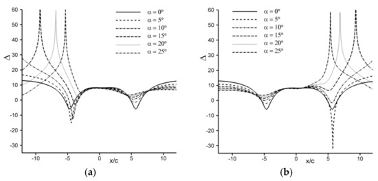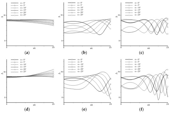 To explore that point, the variability of the wall-recorded deltas towards the source frequency is investigated in a more systematic manner. For all given incidences (α = 0°, 5°, 10°, 15°, 20°, 25°), Figure 11 depicts the top and bottom walls’ respective RMS delta as a function of the source frequency (St = 0.0147 to 2.94, with ΔSt = 0.03675). First, one can see again that whatever the frequency is, the +60 dB delta peaks emerge when the incidence is high enough (α > 10°), whereas moving towards the airfoil as it further increases. One can then observe again that whatever this incidence is, the deltas alternate from positive to negative values as the observer moves along each wall, with such alternance occurring more quickly as the frequency increases. Finally, one can see that, whatever the frequency and incidence are, these deltas are less important on the top (resp. bottom) wall region such that (resp. ).