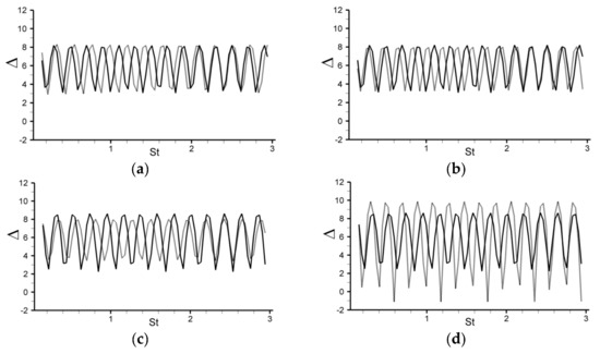 Therefore, for both microphones, the difference in propagation paths becomes Consequently, their RMS delta will be minimum for source frequencies such that , i.e., , with m = 1, 2, …, etc. The lowest one corresponds to m = 1, i.e., λ = 2h. Considering the present Strouhal definition ( and the fact that , this gives St = 1/5 = 0.2, which matches with the above observations, Stmin ~ 0.2 mod(ΔSt). Oppositely, the RMS delta will be maximum for source frequencies such that + 1)/2, i.e., , with m = 1, 2, …, etc. The lowest one corresponds to m = 1, i.e., λ = 4h, i.e., St = 1/10 = 0.1, which matches with the above observations (Stmax ~ 0.3 = 0.1 mod(ΔSt)).