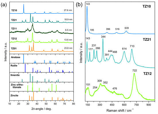 The crystalline phase of the oxide formed upon calcination was assessed via the XRPD analysis (Figure 2a). The diffractogram of sample TZ10 exhibits the peaks typical of the anatase (a-TiO2) tetragonal phase of titania (JCPDS Card No. 21-1272) [28,30,47]. The diffraction peaks of sample TZ01 can be indexed to reflections from the crystallographic planes of the wurtzite hexagonal structure of zincite phase (ZnO, JCPDS card No. 36-1451) [20,21,28,30,47]. The comparison with the literature [26,27,28] proves that the crystalline phase formed in the Ti- and Zn-oxide NFs strongly depends on the Ti:Zn molar ratio in the precursor solution. Most of the peaks appearing in the diffractogram of sample TZ21 are peculiar to the ilmenite-type zinc meta-titanate (ZnTiO3) with hexagonal structure (JCPDS Card No. 26-1500) [48]; besides, two weaker peaks compatible with the formation of a-TiO2 and rutile (r-TiO2, JCPDS Card No. 21-1276) phases of titania are detected. Most of the diffraction peaks of sample TZ12 can be indexed to reflections from the crystallographic planes of the zinc ortho-titanate (Zn2TiO4) with inverse spinel structure (JCPDS Card No. 19-1483) [49,50]; in addition, some weak signal compatible with the presence of r-TiO2 as a secondary phase is observed. In the diffractogram of sample TZ11, the peaks are substantially located at the same angular positions as in sample TZ12, but they are much broader, indicating lower crystallinity and/or crystal size. The average size of the oxide crystallites was estimated from the most intense peak of each XRPD pattern via the Scherrer’s formula, dC = Kλ/βcosθ, where K (0.9) is the Scherrer constant, λ (0.1541 nm) stands for the X-ray wavelength, β indicates the FWHM (full width at half maximum) of the diffraction peak, and θ denotes the reflection angle [21,51]. The dC values obtained (reported in Figure 2a) range between 6.5 and 27.6 nm; they increase in the order TZ11 < TZ12 < TZ21 < TZ01 < TZ10.
