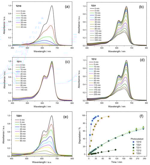 Effect of the variation of the Ti:Zn molar ratio in the precursor solution on the photocatalytic performance of the resulting oxide NFs. (a–e) Time–evolution of the absorbance spectra of an aqueous MB solution with initial concentration of 15 µM and catalyst load of 0.33 mg mL−1, under exposure to 350 nm UV radiation; the shown spectra refer to photocatalysts (a) TZ10, (b) TZ21, (c) TZ11, (d) TZ12, and (e) TZ01. (f) Corresponding degradation rates as a function of time.