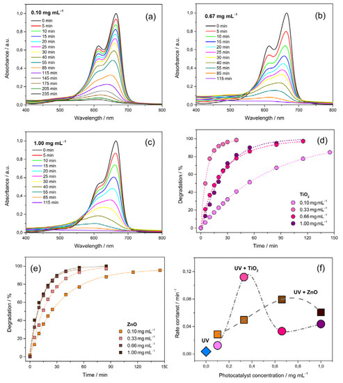 Effect of the load of the electrospun NFs on the photocatalytic performance of a-TiO2 NFs and ZnO NFs. (a–c) Time–evolution of the absorbance spectra of an aqueous MB solution with initial 15 µM concentration and different concentrations of a-TiO2 NFs, under exposure to 350 nm UV radiation. (d,e) Degradation rates of photocatalysts (d) TZ10 and (e) TZ01 as a function of time. (f) Concentration-dependence of the corresponding rate constants.