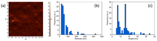 (a) Representative AFM image of NF-composing nanoparticles in sample TZ10. (b) Diameter and (c) height distributions.