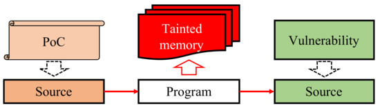 - The memory affected by the PoC. This part mainly judges which memories may be affected by the PoC. It is required for the exploit since the PoC is converted into the EXP by creating the memory affected by the PoC.Taint analysis is used to acquire this kind of memory. The PoC is marked as the source of taint, and the location where the PoC triggers the vulnerability is marked as the sink of taint, as shown in Figure 4.