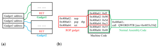 The feature of ROP gadgets is a series of register operations, system calls, etc. with an end of ret instructions. The ret instructions allow gadgets to be linked and then combined to perform the required function, as shown in Figure 5a. These gadgets are not limited to the assembly code that exists in the program, but the machine code that exists in the process memory. In the binary’s assembly code, for example, there are call QWORD PTR [rax+0x4855c35d] instructions that cannot be utilized as ROP gadgets. The intercept portion of the machine code, on the other hand, may turn it into a gadget, as shown in Figure 5b.
