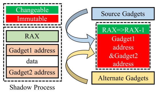 - Available ROP gadgets. This mainly refers to gadgets, which are stored in the memory with a known address and can be used in ROP. If it does not exist, its needs to be replaced with one or some similar gadgets. The gadget with an unknown address should be replaced by one or more alternative gadgets that perform the same purpose. For example, add rsp,8;ret can be replaced by push reg;ret, and leave;ret can be replaced by mov rsp,rbp;ret and textttpop rsp;ret. AEMB sets many basic replacement rules such as as the above-mentioned rules.Furthermore, the AEMB employs the “shadow process”, which is a simulated process that focuses on the memory of the source application in order to determine if the alternative gadget can replace the source gadget. The AEMB will simulate the execution of the source gadget and alternate gadget via the “shadow process”, and record the content of the registers and stack memory. These data are used to ensure the immutability of the normal function of the gadgets (for example, if the RAX register is expected to be executed minus one by source instruction, the alternate instruction should also complete this operation), as well as the immutability of the memory layout, particularly the stack memory layout, as shown in Figure 6.
