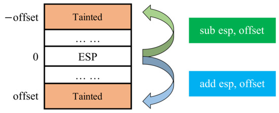 Demonstration of the adjustment of the ESP pointer by add esp,offset and sub esp,offset. The adjusted pointer needs to point to the tainted memory.
