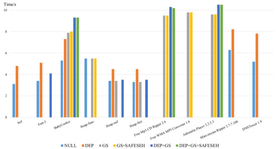 It often consumes more time when bypassing the exploit mitigations under the Windows system, whereas the time consumption under the Linux system is smaller. Real-world applications consume more time than test programs, mainly due to the scale and complexity of the cases. When multiple exploit mitigations are turned on, the bypassing time will be longer.
