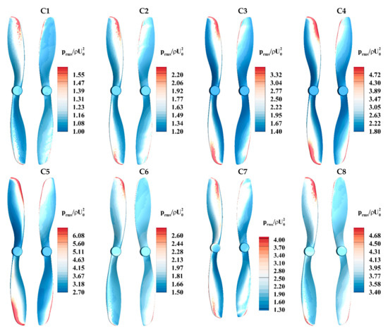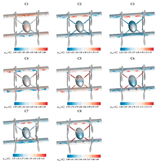 - Johnston, R.T.; Sullivan, J.P. Unsteady wing surface pressures in the wake of a propeller. J. Aircr. 1993, 30, 644–651. [Google Scholar] [CrossRef]