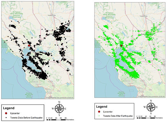 Description of Napa earthquake study area with tweet locations 7 days before the earthquake (left) and 7 days after the earthquake (right).