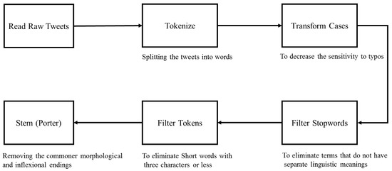 Policymakers and emergency services recently envisaged creative strategies to elicit the information posted on social networks in crises such as an earthquake. These data, however, are sometimes unstructured, diverse, and distributed over a great number of tweets in such a manner that they could not be utilized explicitly. Thus, transforming that chaotic information into a set of explicit and precise texts for a crisis manager is necessary. In this study, data in a text format related to post-earthquake tweets were used for damage assessment. Textual data are regarded as unstructured data that are incomprehensible to computers. Therefore, in order to prepare these data for computer analysis, they must be structured and computer-usable data. In this section, following the process shown in Figure 3, the normalization of unstructured data was performed manually after removing the missing values. At first, during the tokenization process, the textual data were subdivided into smaller linguistic units called tokens. Words, numbers, and punctuation are linguistic units known as tokens. Then, in order to integrate the text in either uppercase or lowercase letters, all the letters in the textual data were converted to lowercase letters. Next, numbers, punctuations and inappropriate letters were removed from tweets. Then, ineffective words (stop words) that do not convey significant semantic content (words like “The”, “On”, “Is”, “All”, and “an” in English) were deleted from the textual data. Short words with three characters or less were removed. After that, stemming was used to return words to their root form, for this purpose, the Porter algorithm, one of the most popular algorithms for performing stemming operations, was used. Finally, using n-Gram algorithms, the expressions and collocation words were removed from the text data [5].
