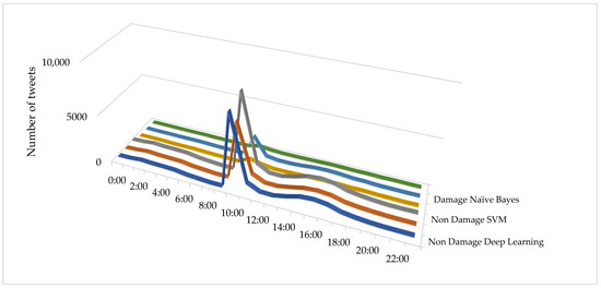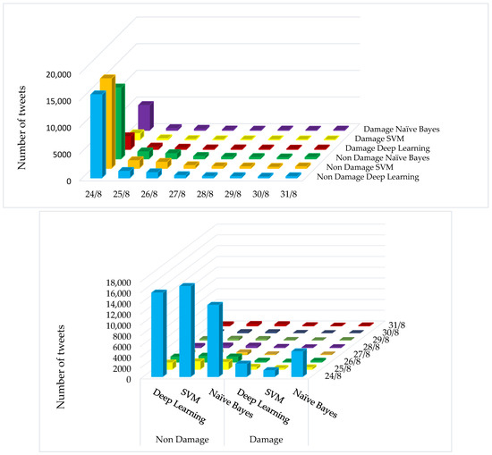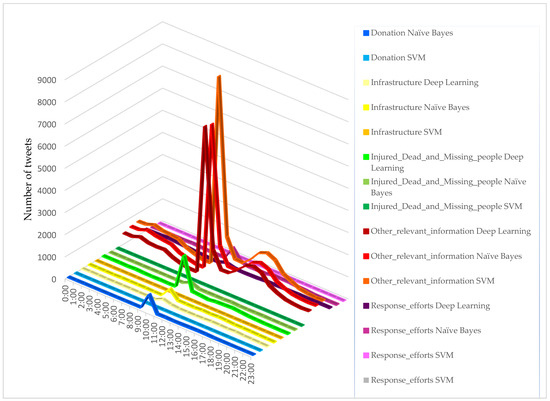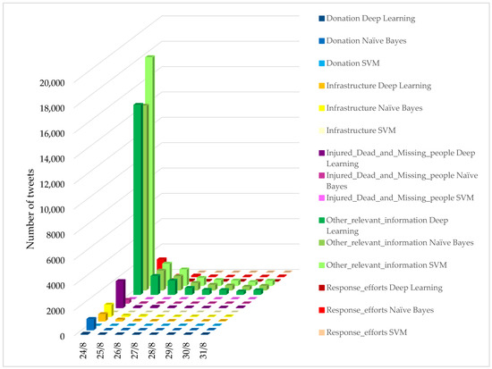 Figure 5 shows the distribution of tweets classified in five classes on each day a week before and after the earthquake (24 August) for the Naive Bayes, SVM, and deep learning classification algorithms. According to the results of Naive Bayes (Figure 5), it can be seen that the tweets collected on the day of the earthquake had the lowest number of tweets for the “Injured_Dead_and_Missing_people”, “Donation”, and “Infrastructure” classes, respectively with 1.54 percent (279 tweets), 4.82 percent (869 tweets), and 5.27 percent (951 tweets). The highest number of tweets also belonged to the “Other_relevant_information” and “Response_efforts” classes, with 80.71% (14,556 tweets) and 7.64% (1379 tweets), respectively. In addition, among the tweets collected in the days following the earthquake, 0.62% (32 tweets), 0.73% (39 tweets), and 4.32% (224 tweets) belonged to the “Donation”, “Injured_Dead_and_Missing_people”, and “Infrastructure” classes, and 5.57% (289 tweets) and 88.74% (4601 tweets) tweets belonged to the “Injured_Dead_and_Missing_people” and “Other_relevant_information” classes, respectively. According to SVM algorithm results (Figure 5), no tweets collected on the day of the earthquake were classified in the “Injured_Dead_and_Missing_people”, “Donation”, and “Infrastructure” classes. The number of tweets in the “Other_relevant_information” and “Response_efforts” classes was 99.97% (18,030 tweets) and 7.64% (1379 tweets), respectively, among the tweets collected on the day of the earthquake. The results of the deep learning model (Figure 5) also showed that the number of tweets collected on the day of the earthquake had the lowest number of tweets for the “Donation”, “Infrastructure”, and “Response_efforts” classes, respectively, with 0.38% (104 tweets), 2.96% (797 tweets), and 6.62% (1779 tweets). The highest number of tweets also belonged to the “Other_relevant_information” and “Injured_Dead_and_Missing_people” classes, with 80.79% (21,711 tweets) and 9.23% (2482 tweets), respectively. In addition, the tweets collected in the days after the earthquake, amounting to of 0.6% (31 tweets), 4.38% (227 tweets), and 5.01% (260 tweets), related to classes “Donation”, “Infrastructure”, and “Response_efforts”, respectively. In addition, 5.09% (264 tweets) and 84.92% (4403 tweets) belonged to the classes “Injured_Dead_and_Missing_people” and “Other_relevant_information”, respectively.