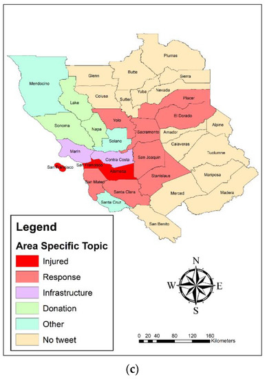 LQ historically has been applied to measure manufacturing or job requirements in the local and national economies. LQ could be used to identify the concentration of phenomena of interest in relation to other events in the special region. In this study, LQ was used to analyze the spatial concentration of discussion topics relating to earthquake crises on the social network. LQ is depicted as a percentage proportion of a specific topic at spatial county unit as compared to the proportion of that exact topic in the state of California in total. LQ is calculated according to Equation (1):