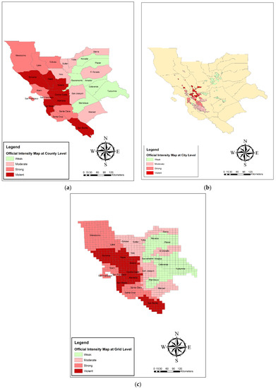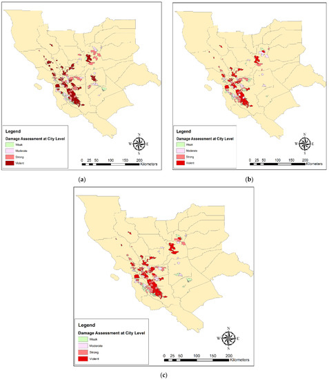 Damage assessment based on social networks can be obtained by the activity-based approach [4]. A standard activity measure is the ratio of messages posted for each scale (spatial unit), which is substantially associated with per capital official damage [21]. In this research, the number of damage-related tweets per population of each spatial unit was applied for the estimation of earthquake damage in three spatial units, which included county, city, and 10 × 10 km grids.