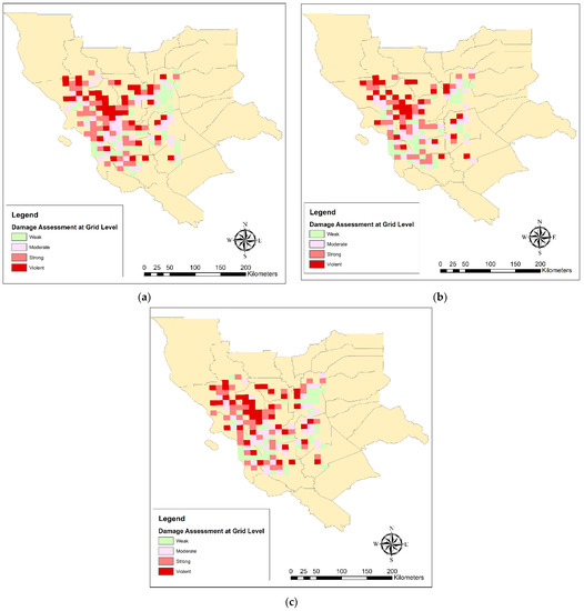 Figure 12 shows the estimated damage map from Naive Bayes, SVM, and deep learning algorithms at the 10 × 10 km grids scale. The results of earthquake damage estimation by three predictive algorithms showed that with increasing distance from the center of the earthquake, the intensity of earthquake damage was reduced.