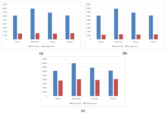 Figure 14 shows the area values (km2) included by each class in our estimated damage map and FEMA HAZUS loss model map for the Naive Bayes, SVM, and deep learning algorithms. Obviously, the area covered by the four classes in the FEMA HAZUS loss model map for all three algorithms must be equal. In addition, the areas covered by the four classes in the estimated damage map for the two Naive Bayes and SVM algorithms were approximately equal. However, the obtained area corresponded to the results of the four classes in the damage map for the deep learning algorithm, on average 2.8 times more than the same value in the two Naive Bayes and SVM algorithms. In general, the results of the deep learning algorithm in the area covered by four classes were closer to the FEMA HAZUS loss model map (official damage map).