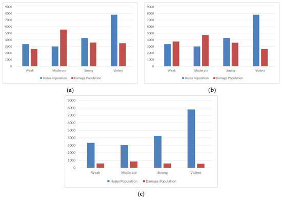 Figure 15 shows the population (in units of a thousand) covered by each class in our estimated damage map and FEMA HAZUS loss model map for the Naive Bayes, SVM, and deep learning algorithms. Obviously, the areas covered by the four classes in the FEMA HAZUS loss model map for all three algorithms must be equal. The populations encompassed by the three classes of weak, strong, and violent were approximately equal in the estimated damage map for the Naive Bayes and SVM algorithms. However, the population size of the moderate class in the Naive Bayes algorithm was almost 800,000 units higher than the similar value in the SVM algorithm.