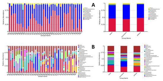 The relative abundances of bacterial compositions of different bacons (A) at the phylum level and (B) at the genus level.