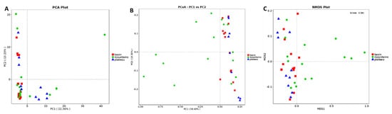 The beta diversity of the 39 bacons at the genus level (PCA (A), PCoA (B), and NMDS (C) scores plotted based on Weighted Unifrac).