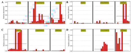LefSe analysis was able to identify statistically significant biomarkers, which were bacterial taxa about significant differences between the groups. The taxon nodes were displayed in terms of LDA scores >4 (Figure A1), and a few predominant genera are illustrated in Figure 4. The relative abundances of Lactobacillus in the mountains and plateau groups were much higher than those in the basin group (Figure 4A), while the opposite was true for Staphylococcus. The results showed that there was a negative correlation in the relative abundance between Lactobacillus and Staphylococcus, which is perhaps one of the most important factors in shaping the typical style of Sichuan bacon. Interestingly, the relative abundances of Lactococcus in the plateau group (Figure 4B), similar to Enterococcus (not listed), were much higher than those in the basin and mountains groups. These genera also can produce a large amount of organic acid, such as acetic and lactic acid, during exponential growth, following conversion to the alcohols and ketone that contribute a richer flavor and aroma to the product [34,35]. It is suggested that Lactococcus and Enterococcus are the predominant acid-producing bacteria rather than Lactobacillus in the plateau group. Moreover, the relative abundances of Brochothrix in the basin group were much higher than those in the mountains and plateau groups (Figure 4C), while the relative abundances of Pseudomonas from the basin group were much lower than those from the mountains and plateau groups (Figure 4D). Although there were undesirable microorganisms present in all samples of Sichuan bacon due to outdoor ripening processing, the undesirable microflora was different between regions, which means that different strategies should be prepared to ensure the safety of the products.