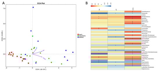 The parametric correspondence analysis (A) and Spearman analysis (B) of the top genera and environmental factors among the three regions.