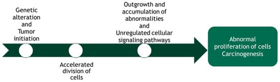Usually, different forms of cancers share an etiology of oxidative stress associated with inflammation, DNA damage, and disrupted immune processes. Accumulation of mutations in genes encoding homeostatic regulators of DNA mismatch-repair factors, predominantly in stem cells becoming CSCs (cancer stem cells) is the leading event in carcinogenesis. The immune system and inflammatory reactions are activated when pathogens or other non-self-molecules enter an organism. Their role is to eliminate the threat agent or to control systemic colonization, but the same physiological responses induce repair mechanisms that recover the function and integrity of tissues in an organ with a tumor [25]. In carcinogenesis, a shift from anti-inflammatory to pro-inflammatory pathways is observed, and excessive production of inflammatory agents and cytotoxic mediators (like reactive oxygen species) promotes genomic instability and neoplastic development. Under these circumstances, the immune system can no longer maintain cell and tissue homeostasis (Figure 2) [26].