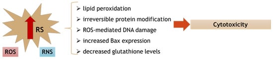 Oxidative stress occurs as a state of disturbance between free radical production and the capability of the body’s antioxidant system to counteract them. Free radicals are classified as reactive oxygen species (ROS) or reactive nitrogen species (RNS), and both possess unpaired valence electrons, which make them highly reactive. The salivary antioxidant system is one of the most critical defense mechanisms, and it consists of enzymes (peroxidase, catalase, superoxide dismutase, glutathione peroxidase) and other compounds, like glutathione, and vitamins E and C [26,27,28]. Glutathione is one of the most important antioxidant agents, vital for protecting cells against oxygen reactive species, but also against the reactive aldehydes found in e-vapors. The thiol group of the glutathione molecule reacts with the electrophilic aldehydes and forms GSH-aldehydes adducts (mainly GSH-acrolein and GSH-crotonaldehyde) [29]. When the natural defense systems are overwhelmed, structural alterations and DNA damage can appear. The most abundant oxidative DNA lesions are considered to be 8-oxo-7,8-dihydro-2′-deoxyguanosine (8-oxo-dG), and exposure to e-vapors is linked to a higher frequency of 8-oxo-dG. Chronic oxidative stress can also cause impaired BER (base excision repair) activity, which reduces the efficiency of DNA repair [26,27,28].