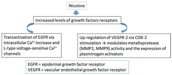 Nicotine’s implication in cancer development can be also explained by the stimulating effect this compound has on both growth factors, and growth factors receptors (Figure 5) [59].