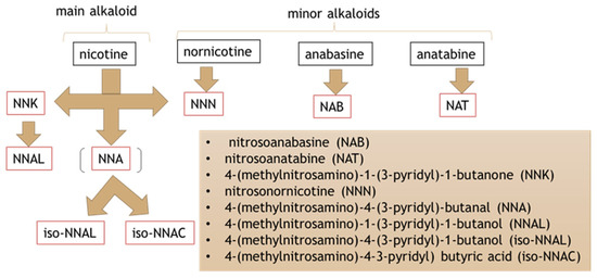 Tobacco-specific nitrosamines (TSNAs) are considered important risk agents in the induction of smoking-related cancers of the lungs, pancreas, esophagus, and oral cavity. NNK (4-(methylnitrosamino)-1-(3-pyridyl)-1-butanone) and NNN (N′-nitrosonornicotine) are included in Group 1 of carcinogens to humans by the World Health Organization (WHO) International Agency for Research on Cancer (IARC) [69].