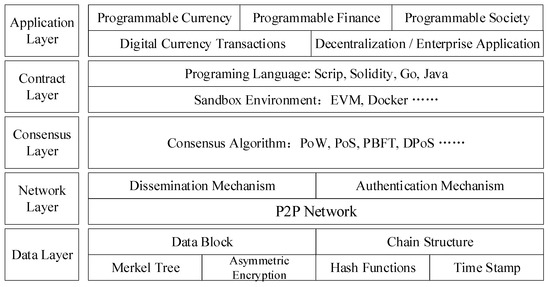 Blockchain platforms are implemented by various methods, but are generally divided into data, network, consensus, contract, and application layers [22], as shown in Figure 1. The data layer records and stores information on the chain, and uses a Merkel tree, asymmetric encryption algorithm, and a timestamp to ensure that data cannot be tampered with and are traceable. Through the peer-to-peer network, the network layer achieves communication between nodes. The consensus layer uses consensus algorithms to achieve a stable consensus between distributed nodes, ensuring data consistency and authenticity. The contract layer provides a smart contract development environment, including the sandbox environment of the blockchain platform and the corresponding programming language. The application layer employs various combinations of programmable currency, finance, and society, according to different application scenarios [23].