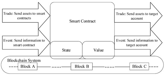 A smart contract is not just a simple computer program, it also can be a participant in a system [25]. It can proactively respond to received commands; perform judgment, value acceptance, storage, and transmission operations; and process and send information. Figure 2 shows the smart contract model in the blockchain, where it has its own independent states and assets. When receiving assets or information from the outside world, a smart contract performs operations according to the established rules. After the execution is completed, the corresponding information or assets are sent to the target accounts.