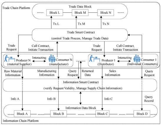 The supply chain system has high requirements for the real-time nature of the trading process, while information sharing is mainly concerned with availability, reliability, and security. Combining the characteristics of the supply chain system and blockchain technology, we divided the system into a trade chain and information chain platforms, as shown in Figure 3.