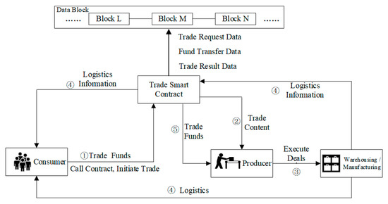 In the supply chain, consumers conduct transactions by calling trade smart contracts, as shown in Figure 4. The consumer sends a trading request to the trade smart contract account, and the trade smart contract verifies the content of the request and sends it to the corresponding producer, who proofreads the request and executes the trade. The logistics information of the product is sent to the trade smart contract, which forwards the information to the consumer. After receiving the product, the consumer sends confirmation information to the trade smart contract, and transaction funds are paid to the producer. Information on the completed transaction is packaged by the trade smart contract and uploaded to the information alliance chain.