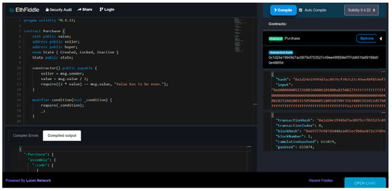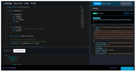 A smart contract can be compiled and deployed after the smart contract design is completed. This paper uses the Solidity programming language [26], kernel version 0.4.22, and an EthFiddle-Solidity compiler. The compilation results are shown in Figure 6 and Figure 7.