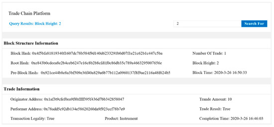 A test was performed on the trading function of the trade chain platform. During the transaction process, the trade chain platform must complete legality verification, result confirmation, and fund transfer. The test simulated the transaction process through virtual transactions between any two nodes in the system. The details of the transaction process were controlled by the trade smart contract. The system functions were analyzed by the transaction information stored in the corresponding block after the transaction was completed. The block information is shown in Figure 10. According to the test results, the trade chain platform could realize the transaction legality verification, transaction result identification, and transaction fund transfer functions, and could store transaction information, which meets the basic requirements of supply chain transactions.