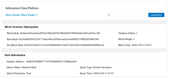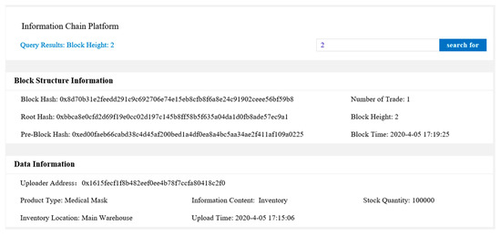 The function test of the information chain platform was then carried out. When a node uploads or obtains information, the information chain platform must verify the node’s identity, permissions, and operation objects. After the operation is completed, the information chain platform stores relevant records in the information alliance chain for later verification. The test simulated the workflow of an information chain platform by uploading virtual information through a node and obtaining the information from another node. Figure 11 shows the product information uploaded by an enterprise to the information alliance chain, and Figure 12 shows the operation record of the information smart contract after a user obtained product information. It can be seen that the information chain platform could realize basic information upload and information acquisition functions.