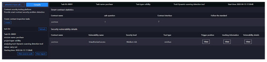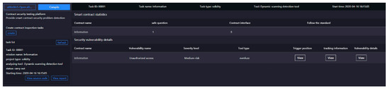 We start with the check on the vulnerability of smart contracts, using the ant blockchain BaaS platform for vulnerability detection. This platform integrates smart contract detection functions and can detect common security vulnerabilities such as unauthorized access and re-entrant attacks that may exist in smart contracts [31]. Figure 13 and Figure 14 show the detection results of trade smart contracts and information smart contracts, respectively. The results reveal unauthorized access vulnerabilities in both, primarily because the user lacks the identity authentication step when triggering the state change operation to modify unrelated state variables. In the later stage of system improvement, it is necessary to add an identity authentication mechanism when calling unrelated state variables.