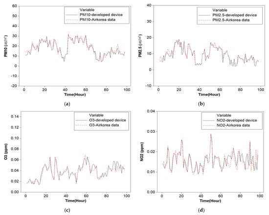 In order to test the reliability of the developed device, a comparative test with other specialized environmental devices, an accuracy test, and an operating temperature test were conducted. Comparative test items were PM10, PM2.5, O3, NO2, CO, and SO2. The accuracy test items were temperature and humidity. The operating temperature test range was −20 °C to 60 °C. Eight out of the sixteen items were tested; the other items are scheduled to be conducted through a closed chamber test through an accredited testing laboratory.