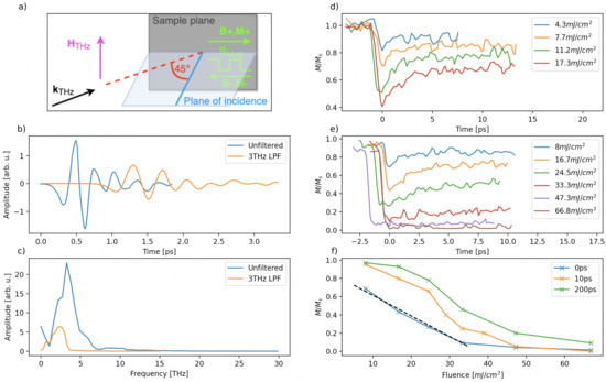 Through the 3 THz filter, the maximum achievable THz fluence on the sample is mJ/cm, leading to an instantaneous demagnetization (dM/Ms) of 60%, as shown in Figure 1d, where the time axis of the signals was shifted such that maximum demagnetization is observed at 0, and the timescale of remagnetisation can be compared for all pulse fluences. Extending the spectrum with the 6 THz filter, presented in Figure 1e, allows for much higher peak fluence up towards mJ/cm (equating to a peak incident magnetic field of 3.7 T in free space). This offers the possibility of complete demagnetization without sample damage at 47 mJ/cm, as alluded to in Figure 1f, where magnetisation is shown to recover. Measurements of the reflected pulse show that around 90% of the pulse fluence was reflected. This suggests that roughly 10% of the incident fluence is absorbed. Therefore, this corresponds to an absorbed fluence of ∼4.7 mJ/cm.