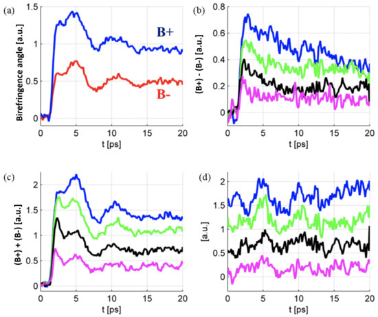 (a) The THz-induced birefringence in Ni using an external mechanical chopper under and external magnetic bias B+ & B— with a fluence of 190 mJ/cm. (b) The extracted magnetic response (demagnetization) obtained from B+ —B—. Blue, green, black, and magenta refer to the fluences of 47, 85, 123, & 190 mJ/cm. (c) the total electronic and structural response is obtained using (B+) + (B—) which contains both thermal excitation and acoustic phonons. The latter is independently shown in (d).