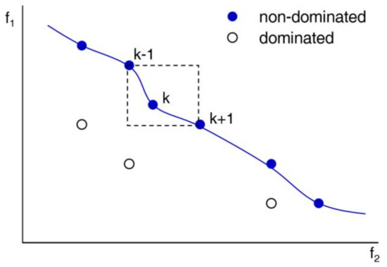 To maintain the solution diversity, the crowding distance calculates the congestion degree of each individual and other individuals [7,8,9] (Figure 2). Equation (4) defines the –th individual’s crowding distance ().