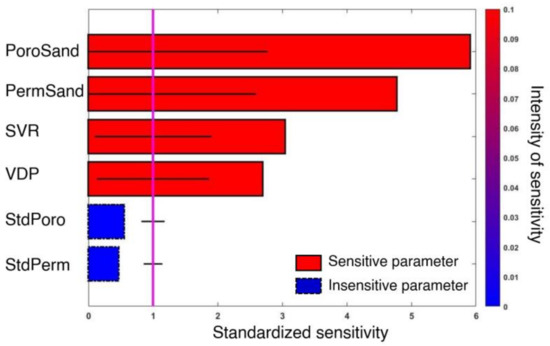 DGSA result. The abbreviations of spatial parameters are in Table 1. PoroSand, PermSand, SVR, VDP, StdPoro, and StdPerm represent the mean porosity of sandstone, the mean permeability of sandstone, shale volume ratio, Dykstra–Parsons coefficient, the standard deviation of sandstone porosity, and the standard deviation of sandstone permeability, respectively. The Pareto bars are colored according to the percentile values. The horizontal black line represents confidence interval within a parameter that is still accepted as influencing. The vertical line means the significant level (if the standardized sensitivity is greater than 1, it means that the parameter is sensitive to the response).