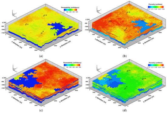 Multi-objective optimization requires a lot of simulation runs and, thereby, this work selects two different aquifers based on the DGDA result (Table 2; Figure 4); one is the less heterogeneous (L aquifer; less heterogeneous relevant to the small value of Dykstra–Parsons coefficient) and the other is highly heterogeneous (H aquifer; the high heterogeneity). Figure 4 demonstrates spatial distributions of the key properties influencing the trapping amount: Figure 4a,b show permeability and porosity of L aquifer, while Figure 4c,d illustrate those of H aquifer. Upon comparison of the two aquifers, L aquifer is capable of storing more CO2 and induces slow fluid transport through sandstones (because L aquifer has the smaller sandstone permeability and the larger sandstone porosity; refer to Table 2).