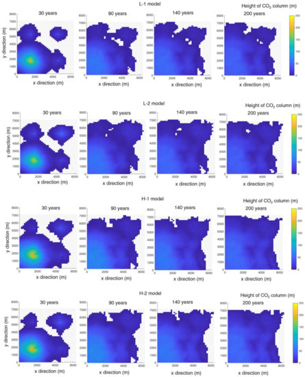 The CO2 volume injected into the aquifer is divided in the order of movable plume, residual trapping with plume, residual trapping, structural trapping, and the combined structural and residual trapping in a row. The form of movable plume accounts for 60 to 70% of the total injection. The simulation results are in agreement with a typical feature of supercritical CO2 plume movement; supercritical CO2 is much more mobile than the formation water and, thereby, moves faster to the aquifer top than brine flows downward [44]. Figure 6 depicts the height of the CO2 column over time. At 30 years, the column is highest near I1 well where most of the CO2 is injected. As time passes, many of the mobile CO2 plumes move upward and spread horizontally when they reach the impermeable cap rock. Eventually, most of the CO2 is present near the top of the aquifer. The column near I1 well gradually decreases and the distributed area expands below the cap rock. Figure 7 and Figure 8 show the spatial distributions of CO2 saturation at the cross sections (A and B line in the x–y plane) for L-1 (Figure 7) and H-1 (Figure 8). CO2 saturation is observed at 200 years. CO2 saturation near the injection wells increases similar to the cone shape, but the area where CO2 is occupied is limited at the upper zones of the aquifer (Figure 7b). The high mobility of supercritical CO2 generates an upward flow mainly, even though the vertical permeability is 0.1 of the horizontal permeability. The horizontal spreading phenomenon is possible when CO2 accumulates below the impermeable cap rock. Notwithstanding that this result explains the characteristics of high-mobile CO2 flow, it requires the detailed description of heterogeneity along a vertical direction.