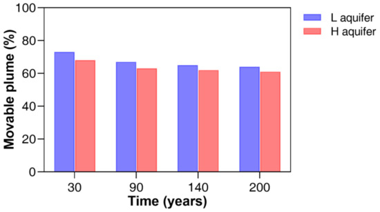 A notable result related to the heterogeneity is found at the decrement trend of the movable CO2 plume (Figure 9); the percentage of movable plume means the volume ratio of movable plume to total injection. It accounts for most of the CO2 sequestration, e.g., 73% for L aquifer (estimated at 30 years). The plume has possibilities to turn into the trap, to maintain itself, or to leak out of the boundaries. Thus, the large amount of movable plume is negative on sequestration. From 30 years to 200 years, the percentage at L aquifer decreases from 73% to 64%, while that of H aquifer is reduced from 68% to 61%. Thus estimates that the heterogeneity degree (Dykstra–Parsons coefficient) contributes to make these differences; the highly heterogeneous H aquifer has more obstruction for plume movement so that the shale beds would be positive in reducing the leakage risk. Figure 10 plots the trends of the combined structural and residual trapping of both aquifers. The less heterogeneous L aquifer increases the combined trapping until 200 years, while the increment in trapping volume of the highly heterogeneous H aquifer stops at around 80 years. This result recommends that if a decision maker wants to sequestrate a small volume within a relatively short time, the high heterogeneous aquifer would be favorable with a large amount of shale layers in the sandstone. However, an increment in the operating cost would be needed to maintain the high injection pressure.