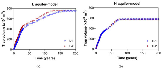 CO2 trapping trends with time: (a) L aquifer model with L-1 and L-2 cases (less heterogeneous); (b) H aquifer model with H-1 and H-2 cases (highly heterogeneous).